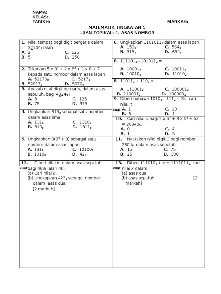 Asas nombor tingkatan 5. Nota padat matematik tingkatan 5 adalah himpunan nota nota matematik yang terpilih dari seluruh negara. B tulis nombor dalam asas baru dengan merujuk kepada baki nombor itu dari bawah ke atas. Nota matematik tingkatan 5 bab 1 asas nombor number bases nombor dalam asas dua asas lapan dan asas lima numbers in base two eight and five nilai digit bagi nombor dalam asas 2 8 dan 5 value of a digit of a number in base 2 8 and 5 bab 2 graf fungsi graphs of functions ii. Scribd adalah situs bacaan dan penerbitan sosial terbesar di dunia.