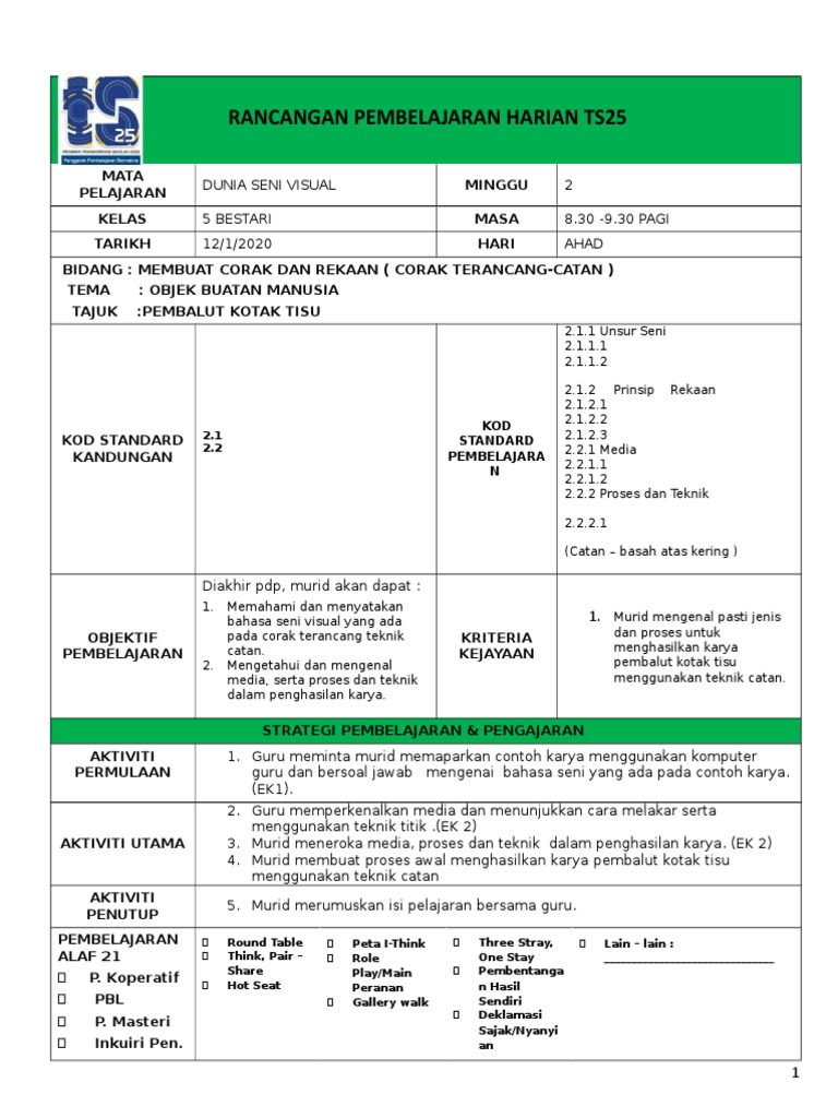 Rancangan Pelajaran Harian Ts25 2 Contoh Terkini