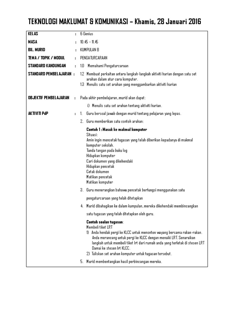 Rph Tmk Thn 6 Setahun 2 Doc Rancangan Pengajaran Harian U2013 Teknologi Maklumat Dan Komunikasi Tahun 6 Tarikh 11 Januari 2017 Bilangan 1 Kelas 6 Course Hero