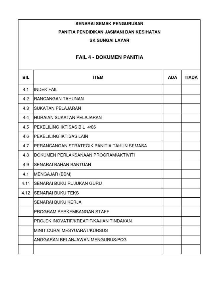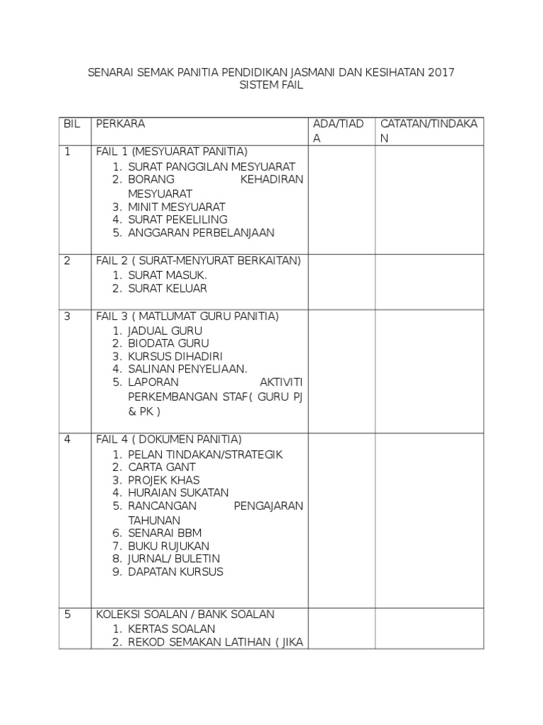 Senarai Semak Panitia Pendidikan Jasmani Dan Kesihatan 2017