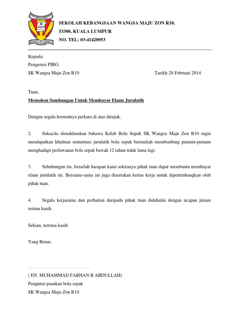 Surat Rasmi Memohon Sumbangan Rasmi Sua